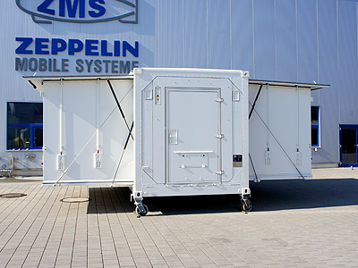 Der zweiseitig erweiterbare Container ZEPPELIN-Shelter® 3:1 bietet mit einer Raumgröße von ca. 27 m² die größtmögliche Arbeitsfläche bei dieser ZEPPELIN-Bauform.